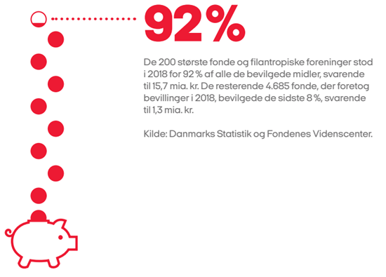 De små og mindre fonde og filantropiske foreninger foretager de fleste af bevillingerne. Ud af de i alt 79.655 bevillinger, der blev foretaget i 2018, blev hele 53.279 - eller 67 % - bevilget af de små og mindre fonde, der hver uddelte mellem 1 og 10 mio. kr.